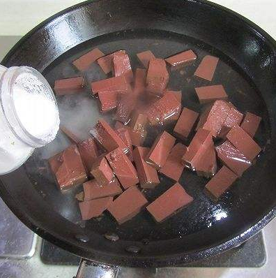 鍋裡倒入適量水,大火燒開,倒入鴨血焯水1分鐘後撈出瀝乾水分,即可去除鴨血的腥味。