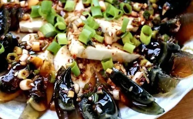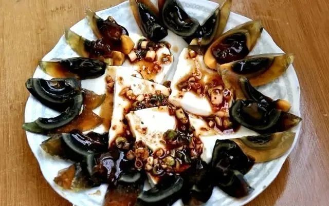 花生豆腐下面把冷藏定型的花生豆腐取出來,倒扣在案板上,用刀切成片,均勻擺放在盤中,再把松花蛋去皮對半切開,擺放在盤子的邊緣部分,淋上調好的料汁,這樣就可以上桌開吃了。