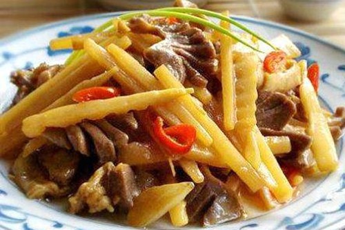 酸筍先用清水浸泡一下,切成片狀,再用清水泡一下,反复擰乾、漂洗、再擰乾,這樣可以減少酸味