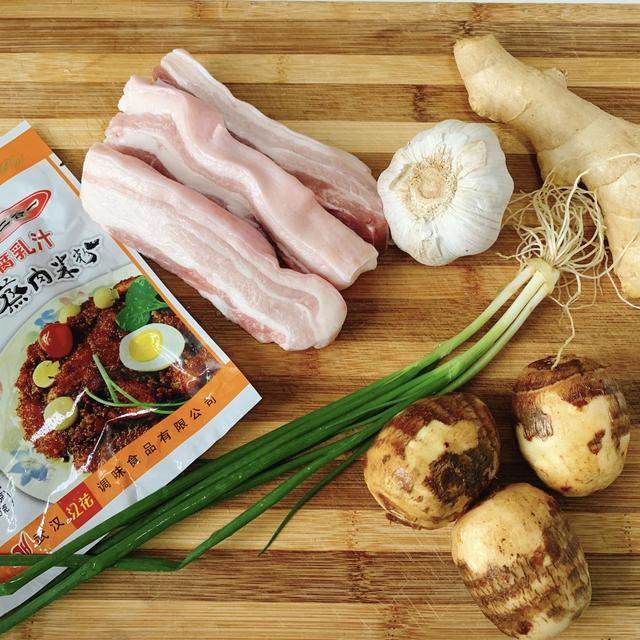 【製作材料】:帶皮五花肉1斤,一勺料酒,一勺雞精。蔥薑蒜適量,芋頭四五個白糖一勺,鹽一勺、江花腐乳汁蒸肉米粉一袋。