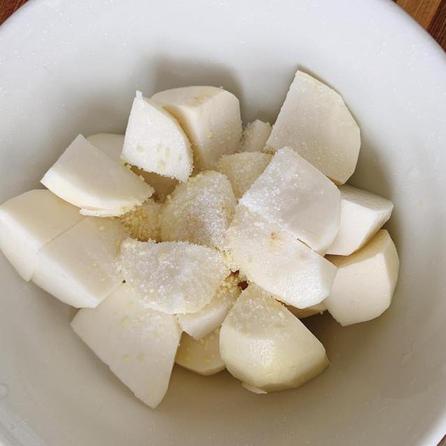 5、 芋頭洗乾淨了以後把皮兒去掉,切成小塊,加入一勺鹽和雞精,充分的攪拌均勻。