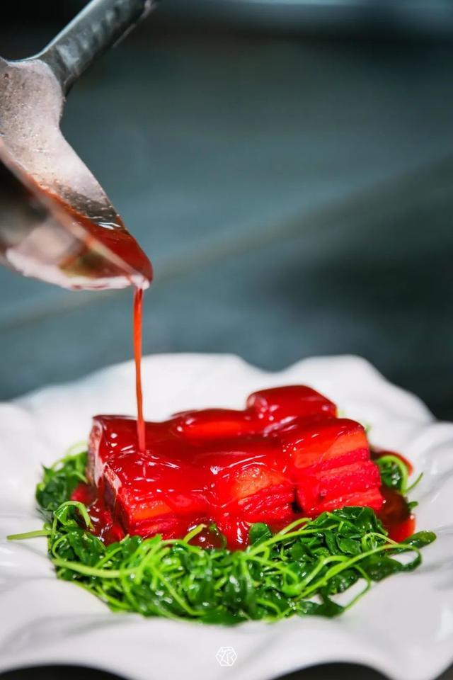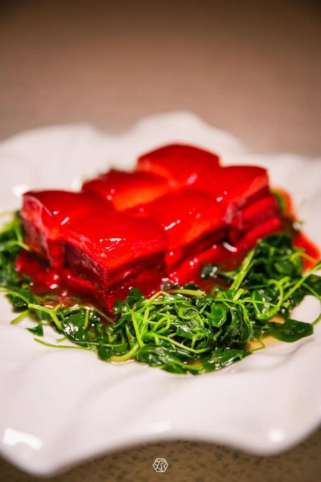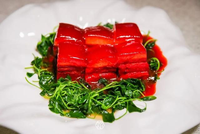 出鍋的時候,盤中用金花菜打底,整整齊齊放入六塊醬汁肉,再淋上一勺濃郁的醬汁。做好的菜餚如同“綠葉襯紅花”,看起來格外賞心悅目。