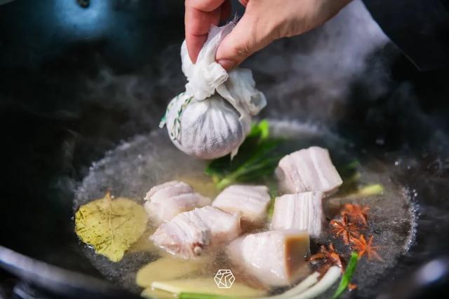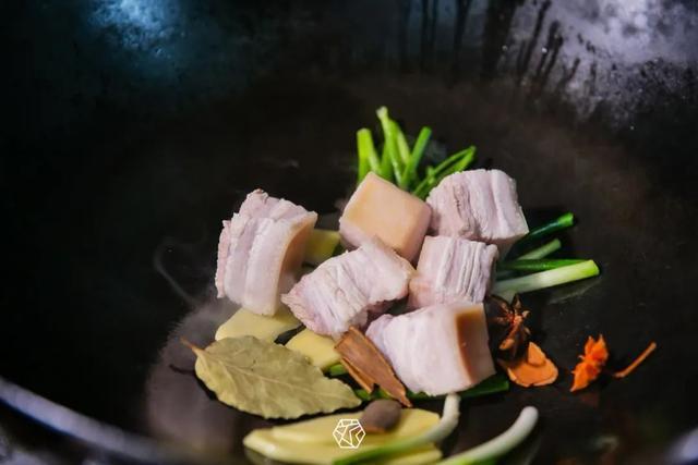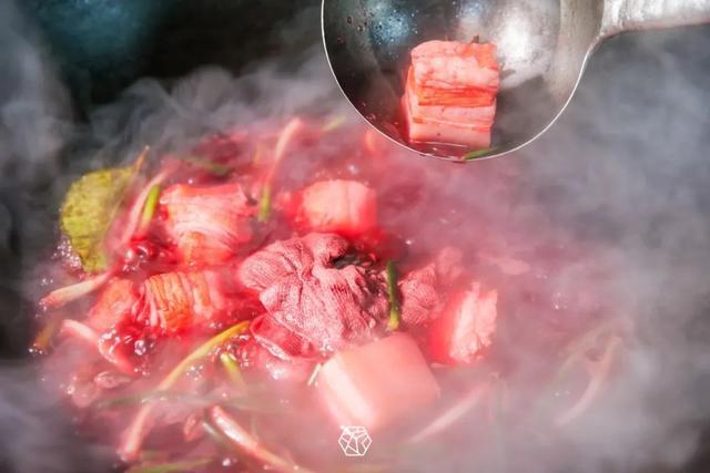 燒製前,先在滾水中焯一下水;接著,放入多種調料、香料以及紅曲米;燒到六成熟時,再加入冰糖。