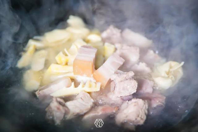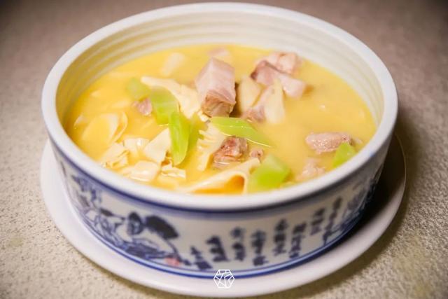 春筍和新鮮排骨先入鍋焯水,接著鍋中留油,放入春筍、排骨、鹹肉和百葉結,加入高湯,用文火慢燉40分鐘。快要起鍋前,再加入萵筍。