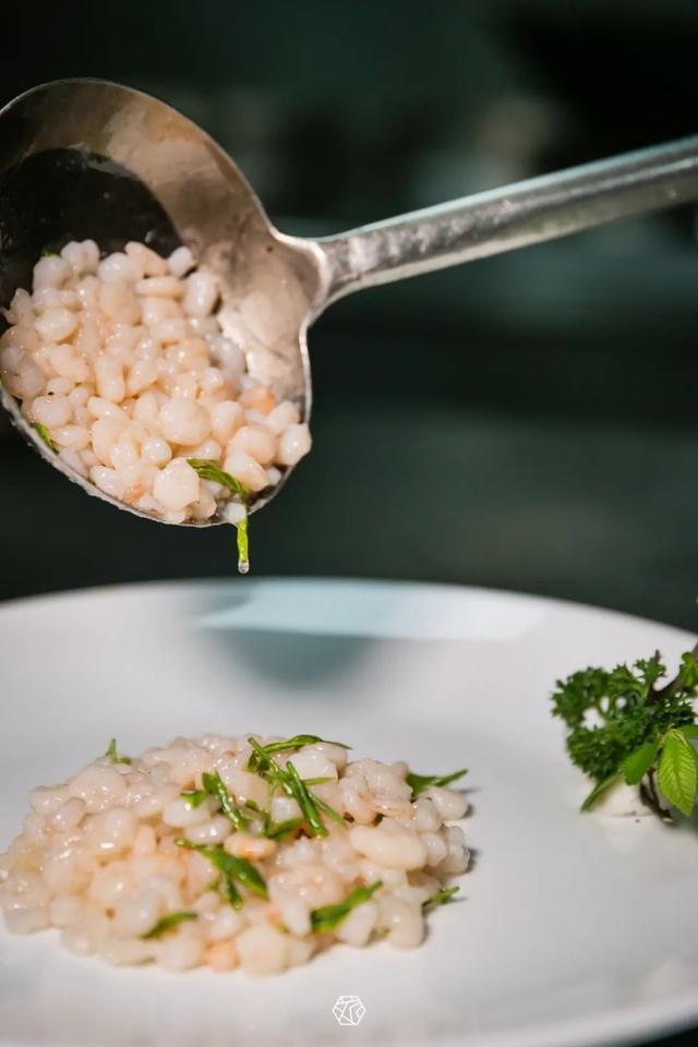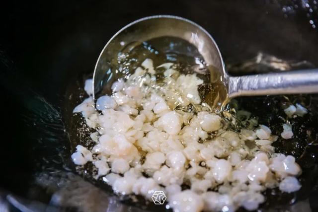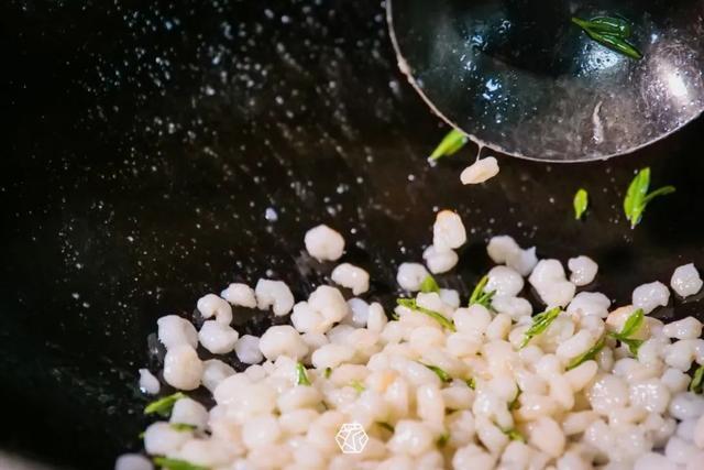 剝好的河蝦仁,先上漿,後入低溫油鍋中滑炒30秒,出鍋前再放入些許碧螺春茶翻炒幾下。