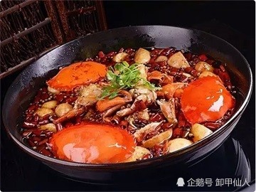2、淨鍋入化豬油燒熱,舀入骨頭湯燒沸後,放入芋兒煨,其間加鹽調味。撈出後,裹一層自製醬放盆裡墊底。另把裹好醬料的蟹塊擺上去。