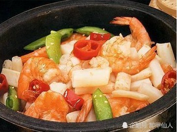 4、石鍋提前放在煲仔爐上加熱,放入圓蔥絲墊底,將炒好的蝦球裝入石鍋內,撒白芝麻。