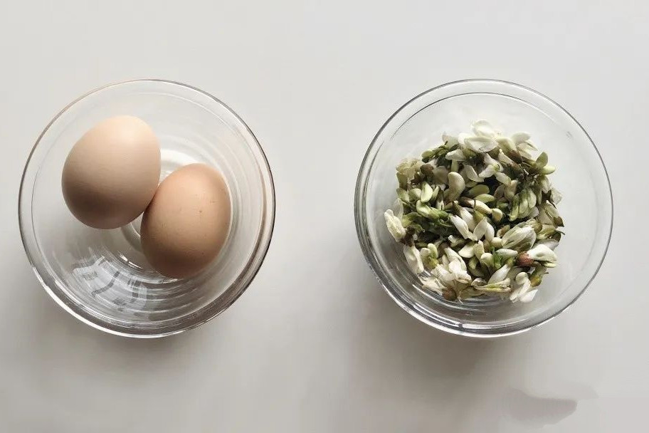製作食材:槐花10克,雞蛋2個(90克),溫水110g