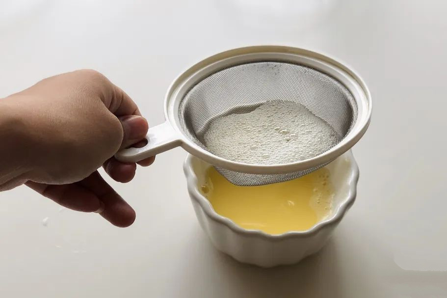 4、雞蛋打散之後,要用網篩先進行過篩,把泡沫和所有雜質全部過濾出來。