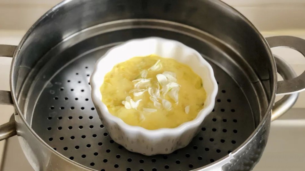8、先用大火蒸10分鐘,然後把蓋子取開,再加入一些槐花瓣,再繼續蒸3分鐘即可出鍋。千萬不能蒸太久,不然蛋會變得很老。
