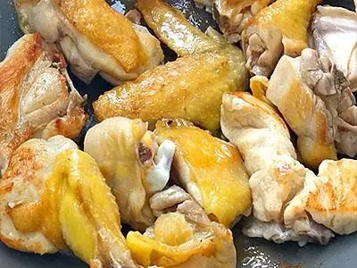 加水將紅棗跟枸杞洗乾淨。再將洗乾淨的紅棗跟枸杞倒出控干水分備用。把鍋燒熱之後,到點油稍微晃動幾下,讓油能分佈的更均勻一些。油熱之後,將醃製好的雞肉塊下鍋,開中小火,煎至兩面金黃。在煎的過程中,需要將雞肉翻面。用這種經過的雞肉熬出來的雞湯會有一種淡淡的雞肉香。