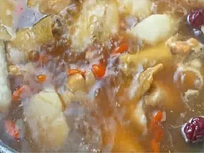 把雞肉煎至兩面金黃中往鍋中加水。然後轉大火燒開。把水燒開記得撇去浮沫,這樣我們成品的湯頭看起來才會更加的清澈。再將剛剛洗乾淨的紅棗跟枸杞下鍋轉小火,燉煮一個小時或以上。山藥比較不耐煮,最近在起鍋前再將山藥下鍋煮,煮山藥時間大約是在三到五分鐘左右。出鍋之前記得要先嚐一下味道,再根據個人的喜好來控製鹽的用量。