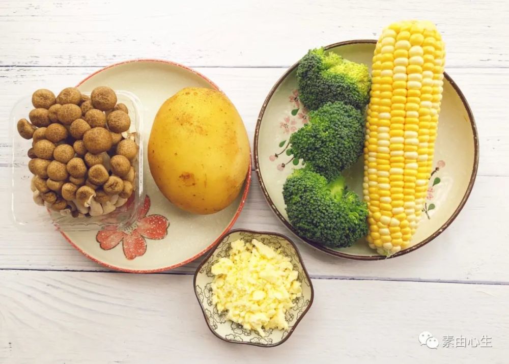 主料:土豆、西蘭花、玉米粒、蟹味菇