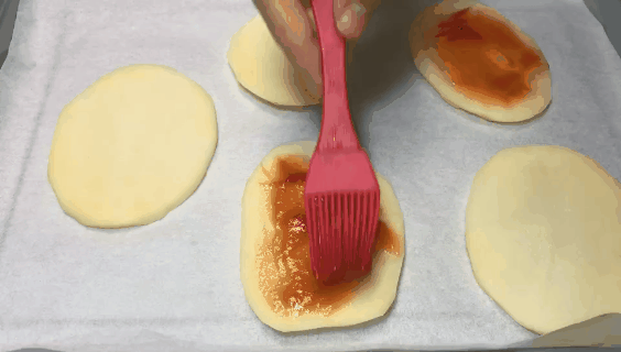 1.土豆盡量選大個點的,把土豆洗淨去皮切片,放入烤盤中,土豆片上刷一層番茄醬。