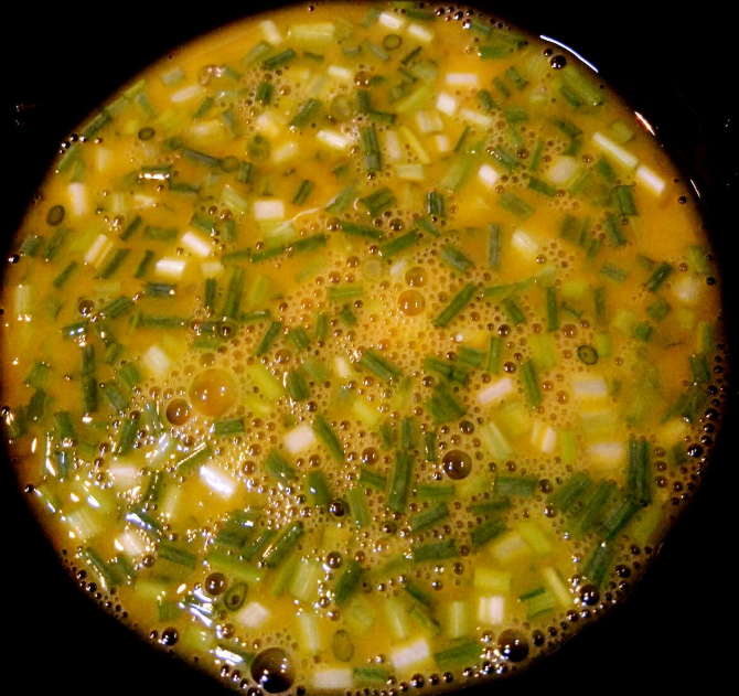 3,接下來,將雞蛋液磕在食材上面,放上適量的鹽,筷子順時針攪拌均勻即可。